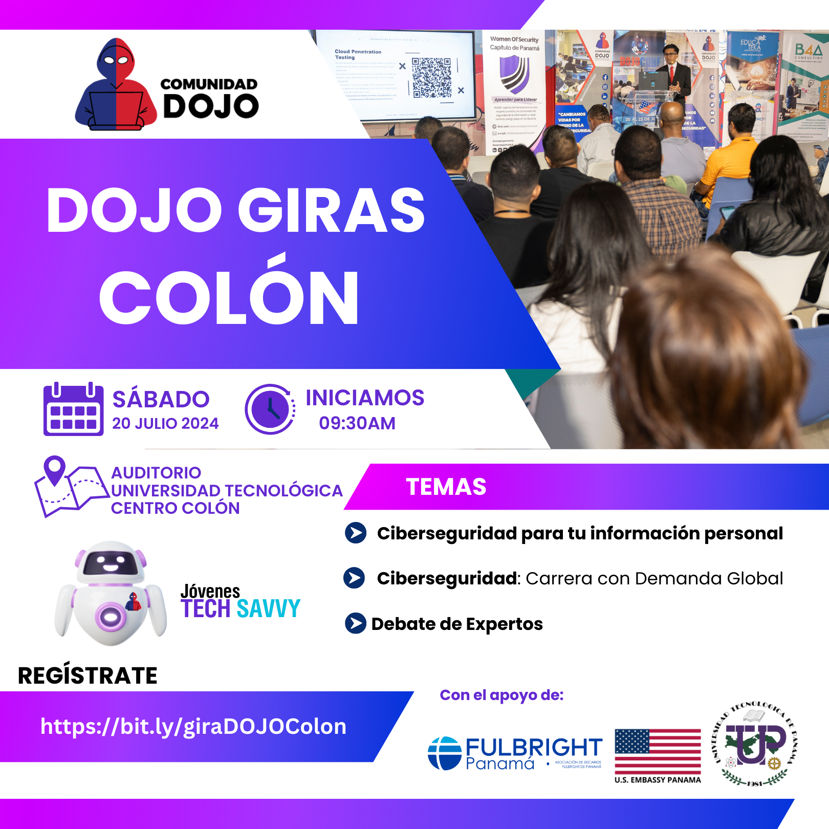En el marco del programa Jóvenes TechSavvy, la Fundación Comunidad DOJO “cambiamos vidas a través de la formación en Ciberseguridad” en colaboración con el Centro Regional de la UTP en Colón, con el patrocinio de la Embajada de Estados Unidos en Panamá y la Asociación Fulbright Panamá, organiza la DOJO Giras Colón donde se presentaran los siguientes temas: En Mundo cada vez más digital. ¿Por qué ciberseguridad es importante?, Carreras y Oportunidades en el campo de la ciberseguridad y la Ingeniería social y buenas prácticas para proteger su información personal.
